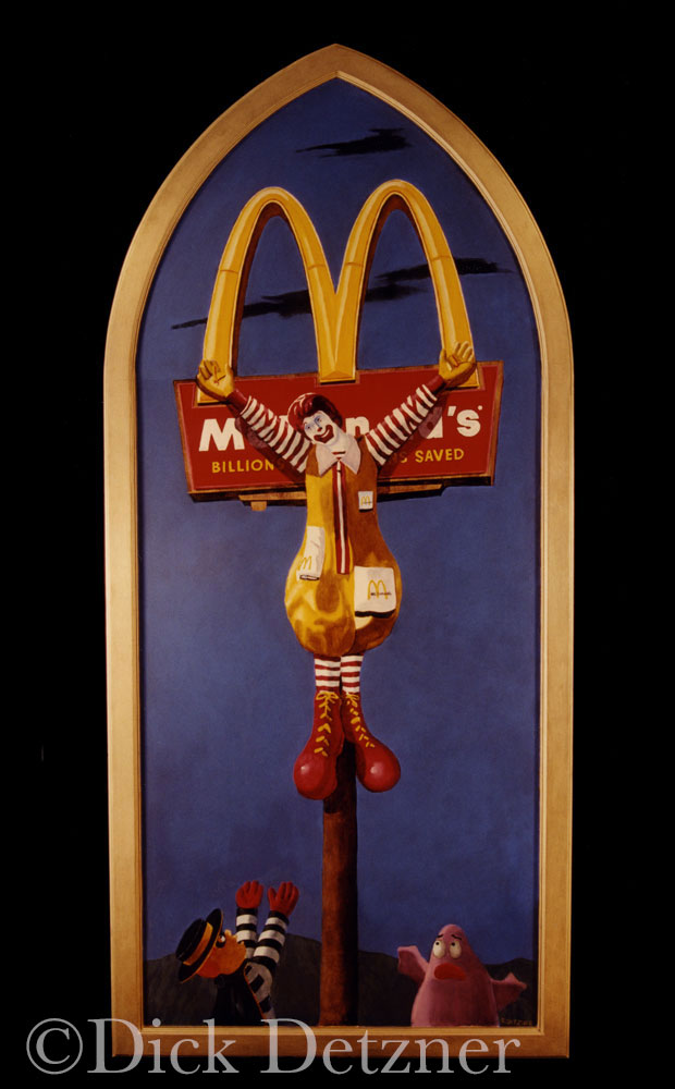 Ronald McDonald crucified on the golden arches, with Hamburgler and Grimace lamenting